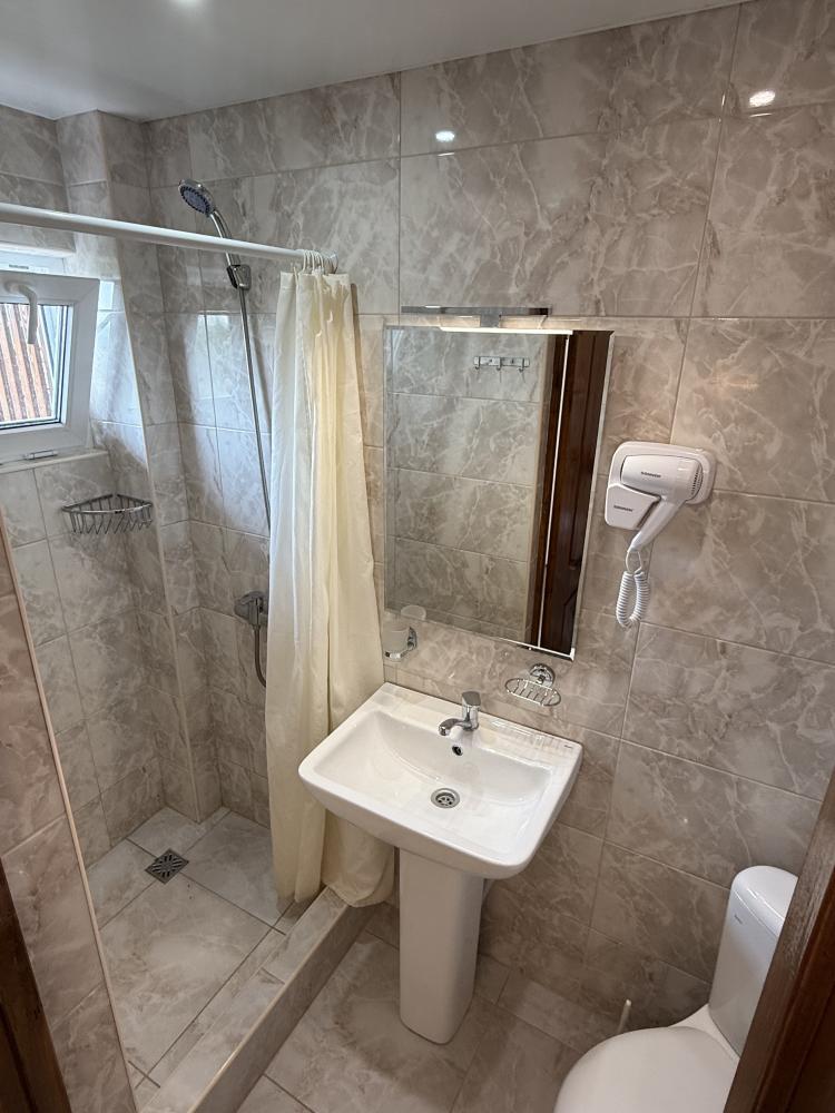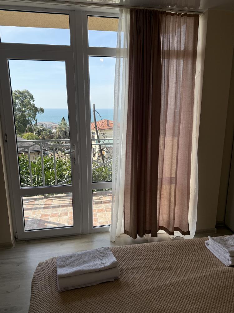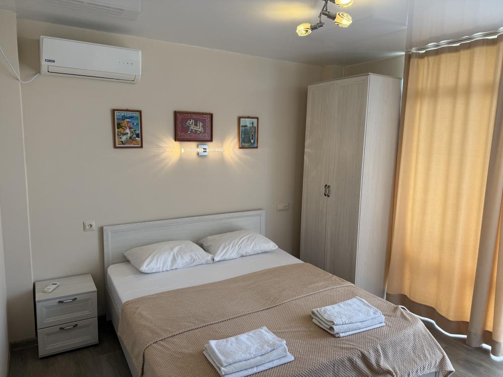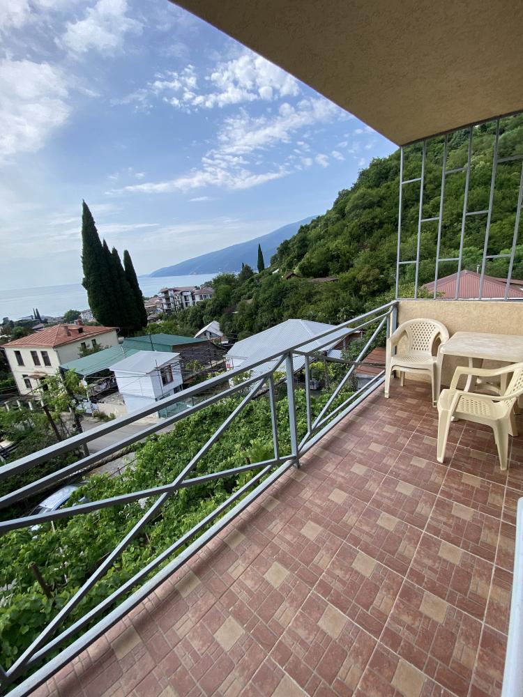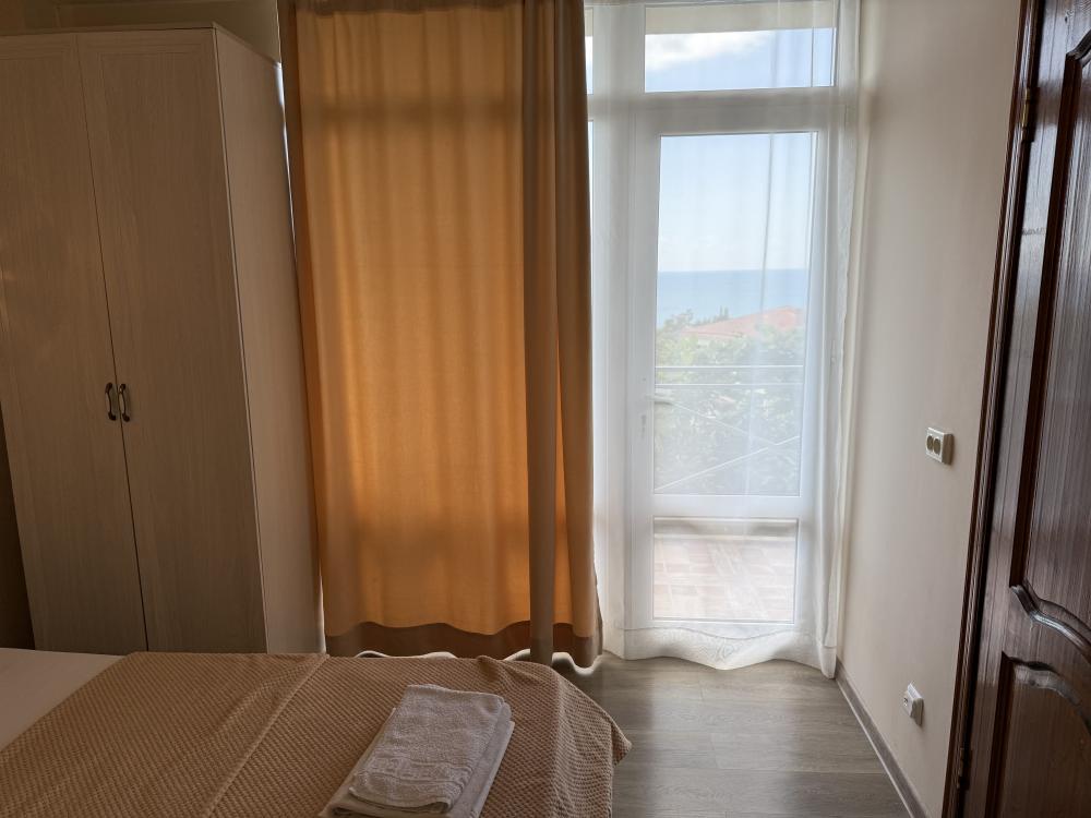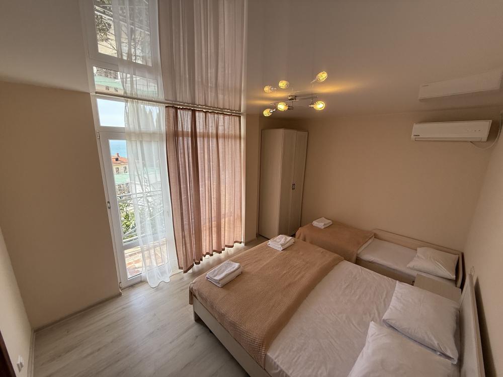 В номере двуспальная кровать и дом место, шкаф, телевизор, кондиционер, санузел. Балкон с видом на море и горы. |