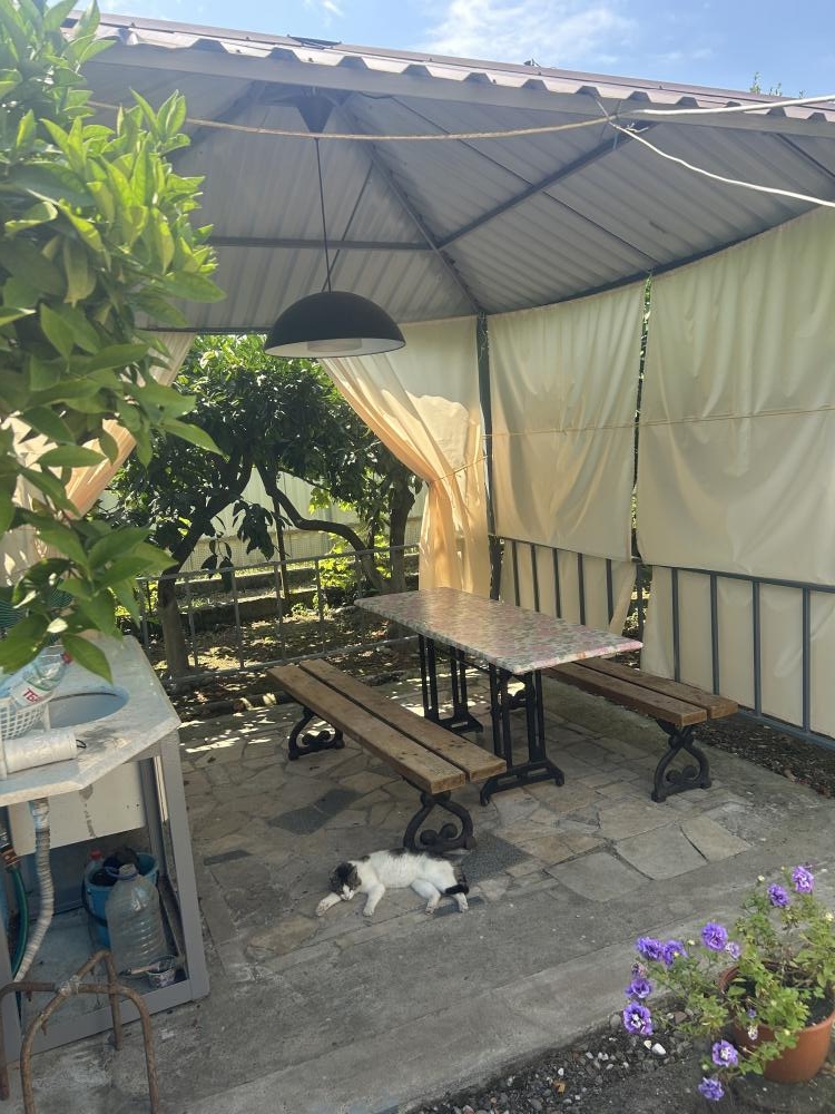 Отличное предложение для маленькой компании! Могу предложить пол дома под ключ (100м2). Есть все удобства, кухня-столовая, ванная комната, стиральная машина, дополнительный санузел во дворе, кондиционеры в комнатах, 2 холодильника, отдельный вход. Уютный дворик, беседка в мандариновом саду, мангал, домашнее вино и др. До моря 10 минут пешком. Дом находится в пригороде Пицунды, 1200 метров до моря и пансионата Самшитовая роща. 5 Минут езды до центра Пицунды.