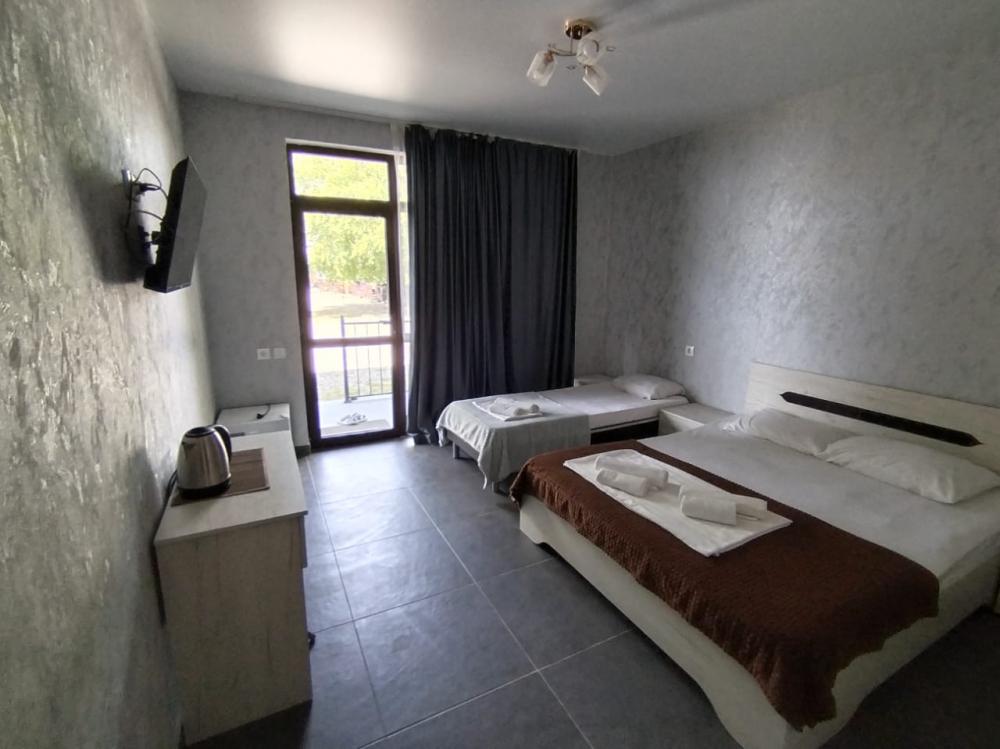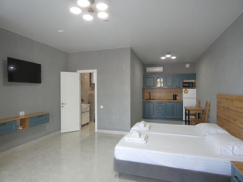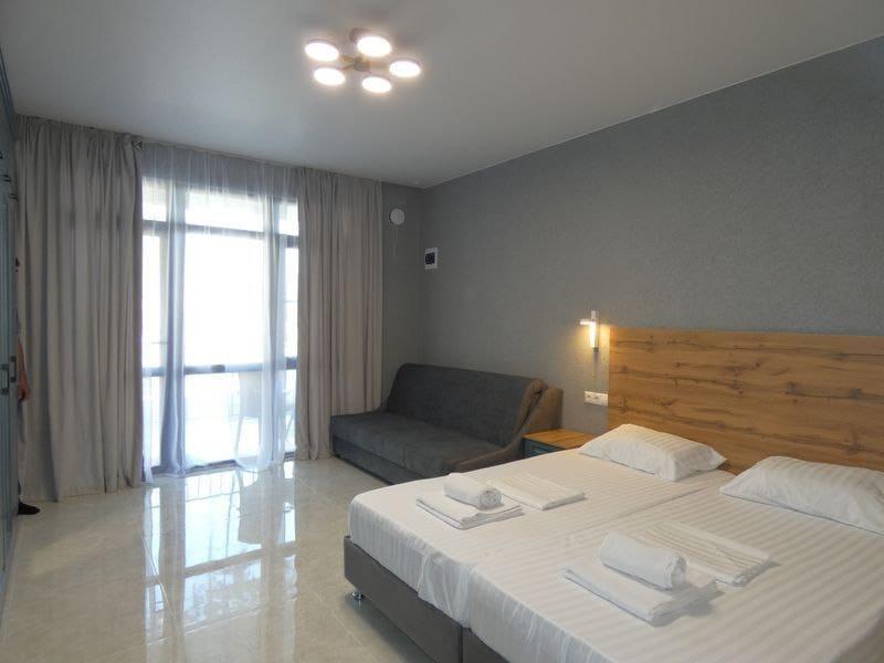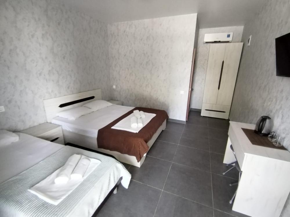 Гостевой дом «Три тополя» расположен в Пицунде (с. Лидзава, район рыбзавода) на самом берегу Черного моря. В наличии всего 10 номеров, 3-х местных, с возможностью размещения еще одного дополнительного спального места. В каждом номере: горячая и холодная вода, душ, умывальник, туалет, кондиционер, мебель, а также пледы и полотенца на каждого гостя. К бесплатным услугам гостей: лежаки под пальмово-бамбуковым навесом на берегу, стиральная машинка, кухня, оснащенная всем необходимым: газ. Плита, холодильники, микроволновка, чайник, посуда, мангал, большой телевизор с кабельными каналами. Бесплатный Wi-Fi на всей территории, бесплатная охраняемая парковка. Из окон открывается вид на море. Все номера гостевого дома «Три тополя» оснащены кондиционером и шкафом для одежды. Рядом с гостевым домом можно заняться различными видами активного отдыха. Размещение домашних животных допускается по предварительному запросу. Для детей есть батут. Поселок Лдзаа (он же в русской транскрипции Лидзава) находится рядом с Пицундой: напрямую расстояние до города примерно 2 км, а вдоль побережья — около 5 км. Расположено на берегу Пицундской бухты Чёрного моря. Сюда приезжают любители тихого, спокойного, по-настоящему деревенского отдыха. Пляж в поселке довольно большой, 4 км в длину, ограниченный скалистым выступом с одной стороны и забором с другой. Как и все местные пляжи, «Лидзава» находится в Пицундской бухте, поэтому здесь практически не бывает ветра и волн. Море чистое и прозрачное — у берега даже видно, как плавают рыбки. Пляж галечный, а растущие вокруг сосны наполняют воздух приятным и вместе с тем лечебным ароматом. Из Пицунды в Лдзаа можно доехать на маршрутном такси — остановка «Рыбзавод». Обычное такси обойдется недорого — в 180-220 RUB, ехать около 10 минут. Телефон абхазский, можно писать и звонить в Ватсап. Есть водные развлечения: батуты, бананы, водные мотоциклы. Прогулочные экскурсии на корабле. Любые виды экскурсий.