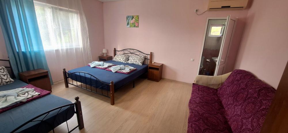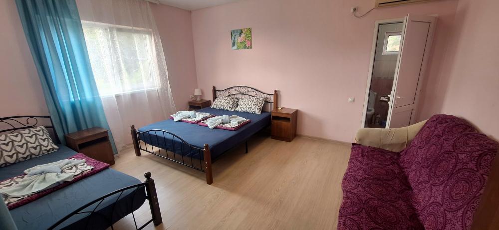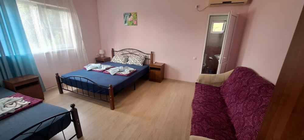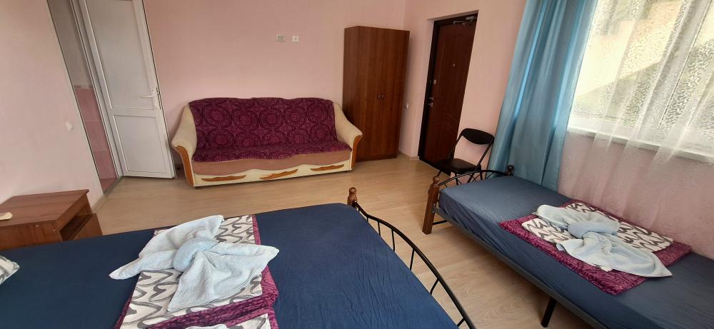 | Номер находится на 2 этаже с двумя окнами, с видом на море и горы! Двуспальная кровать шириной 160см , односпальная кровать и диван, который раскладывается в полноценное двуспальной место! |