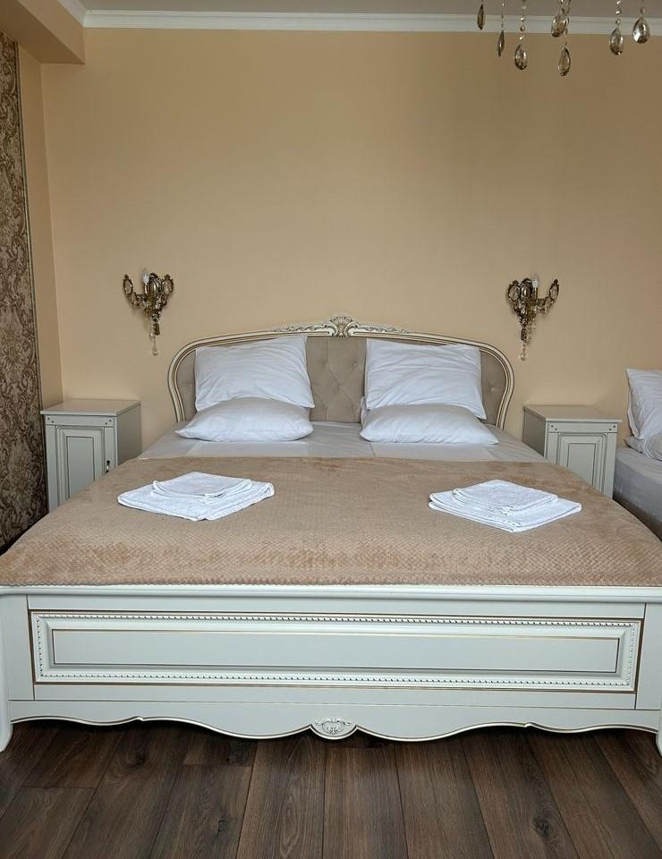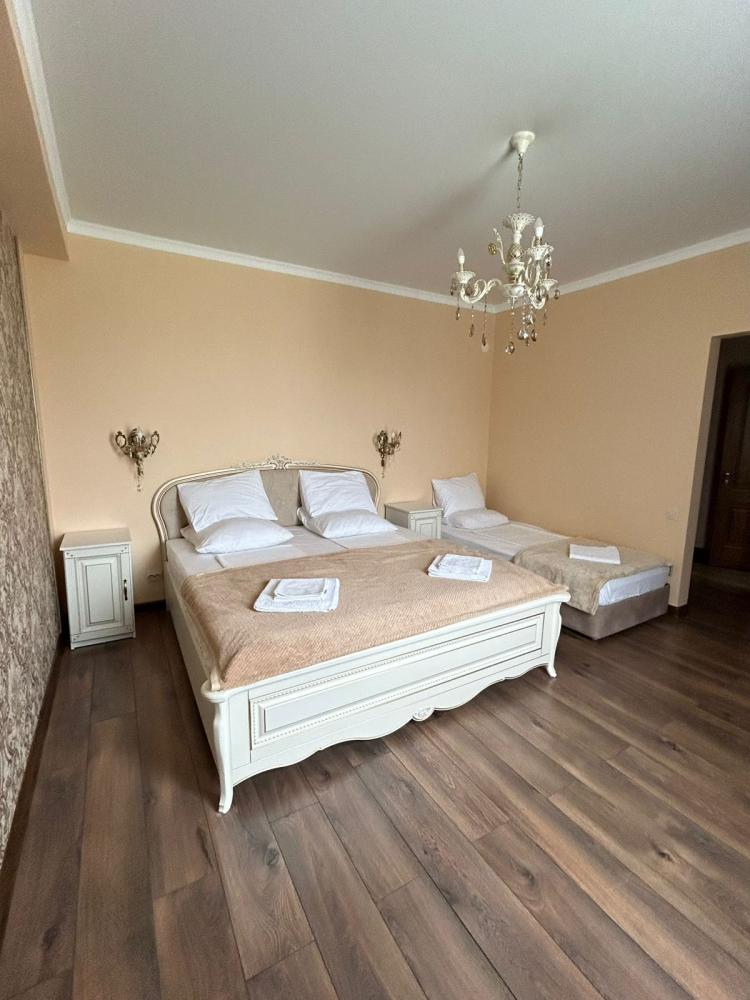| 1 Большая двуспальная и 1 односпальная кровати, вместительный шкаф для одежды, TV с выходом в интернет, Wi-Fi, кондиционер, письменный стол, санузел с душем. Возможность поставить доп место или детскую кроватку. |